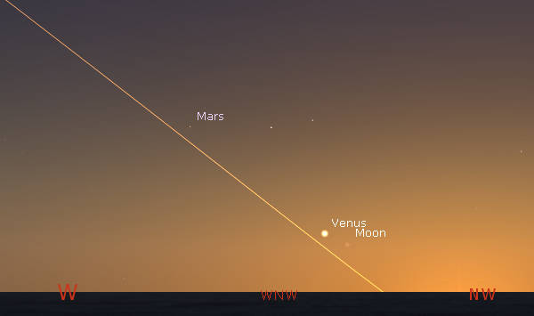 Tonight the thin crescent Moon, some 40 hours old, or more properly 40 hours from eclipsing the Sun, will be to the right and a bit below the bright planet Venus. It might be possible to spot it. I do remember spotting the tiny sliver of a Moon the next evening after a solar eclipse in 1970. But that was in March*, when the ecliptic, the path of the Sun and near the path of all the planets and the Moon, was angled more vertically than it is this time of year. That means that the Moon and planets, when near the Sun, are lower in the sky after sunset than they would be in late winter and early spring. Venus is slowly moving away from the Sun, from our vantage point, while Mars, above and left of it, is slowly retreating toward the Sun. Their apparent paths will cross on July 13th.