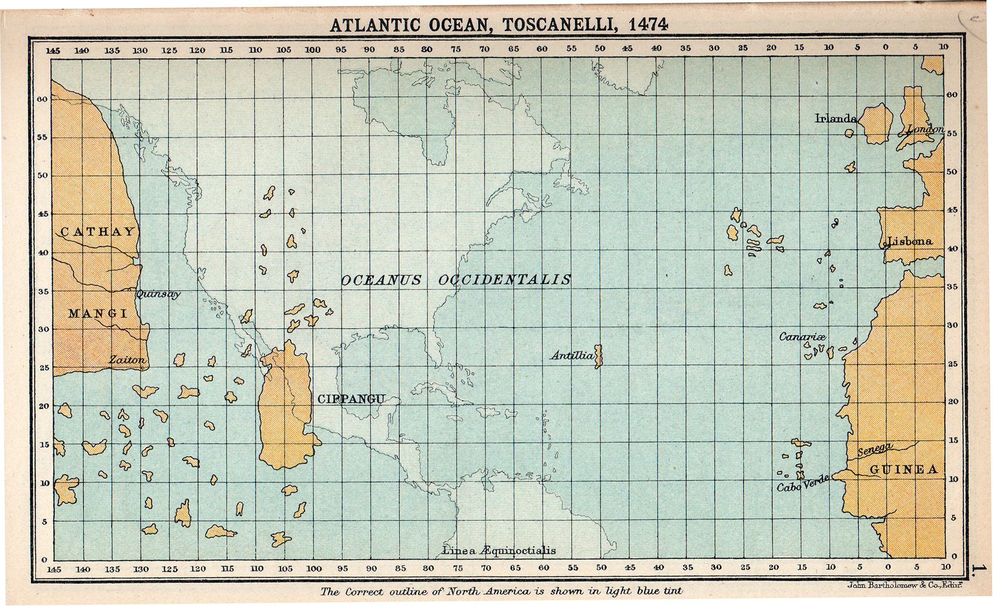 A map of the western ocean (Atlantic Ocean) by Paolo dal Pozzo Toscanelli about 1474 which may have influenced Columbus. North America is superimposed at the proper longitudes. Credit: A literary and historical atlas of America, by Bartholomew, J. G. via Wikipedia. Click to enlarge.