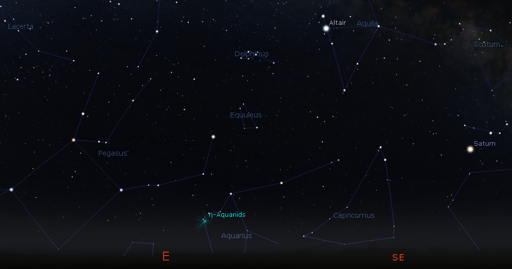 The sky at 4 a.m. tomorrow looking eastward at the Eta Aquariid radiant. Click on the image to enlarge. Created using Stellarium.