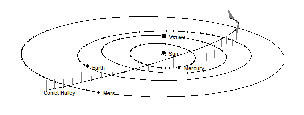 Halley’s Comet has been swinging around the Sun countless times before the Chinese first recorded it. The illustration above shows the last time the comet entered the inner solar system in 1986. The comet’s path is from upper right to lower left. When the comet passes within about 3 astronomical units of the Sun, that is 3 times the Earth’s distance from the Sun, the ices in the comet begin to sublimate, escaping from the comet’s nucleus which liberates dust and larger solid material. The gasses and dust form the comet’s ion and dust tails. The larger material, gravel sized bits, end up in and around the comet’s orbit, and over time are spread out around and near the comet’s orbit. Halley’s orbit crosses the Earth’s orbit twice, inbound and outbound. In both cases these crossings are close enough to the plane of the Earth’s orbit to produce meteor showers.