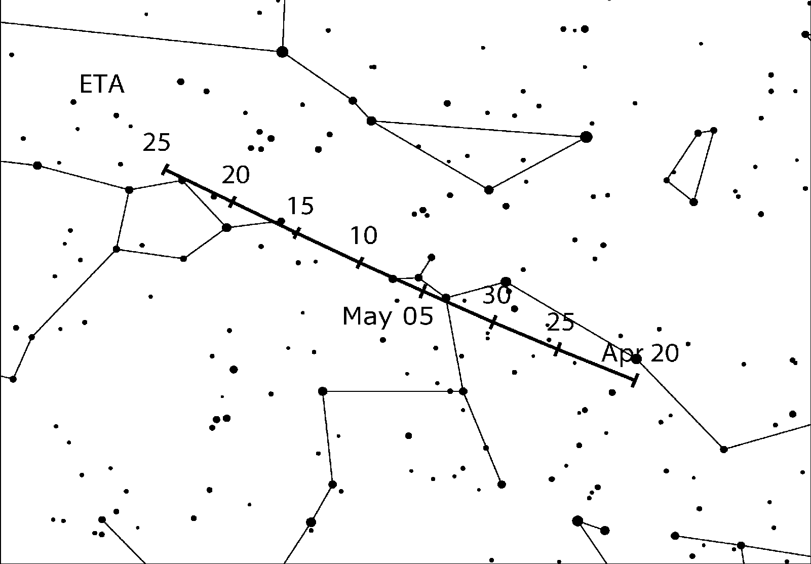 Motion of the Eta Aquariid radiant from April 20 to May 25. The triangle with the star near the center near May 05 is the asterism the Water Jar, a part of Aquarius. Eta Aquarii is the triangle star to the left. Source: PDF version of the International Meteor Organization 2019 Meteor Shower Calendar: https://www.imo.net/resources/calendar/