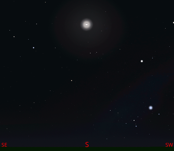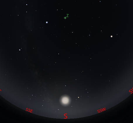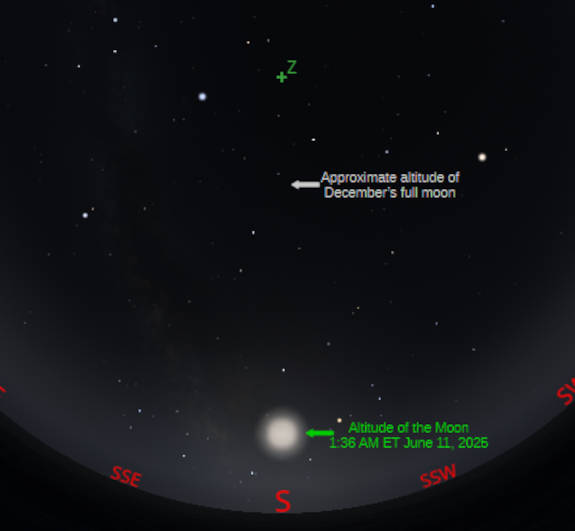 The exact time that the Moon will be full, at least to the nearest minute is 12:54 this afternoon. Have you ever noticed the placement of the full moon in the sky between winter and summer? The full moon near the winter solstice moves very high at midnight, while the full moon near the summer solstice is seen quite low in the south. For the Moon to be full, it must be nearly opposite the Sun in the sky, so we see it fully illuminated as the Sun does. The Moon’s orbit is close to the Sun’s apparent path in the sky, the ecliptic, which is the projection of the Earth’s orbit of the Sun. So the Moon now is near, and actually a bit north of, where the Sun will be 6 months from now in mid to late July.