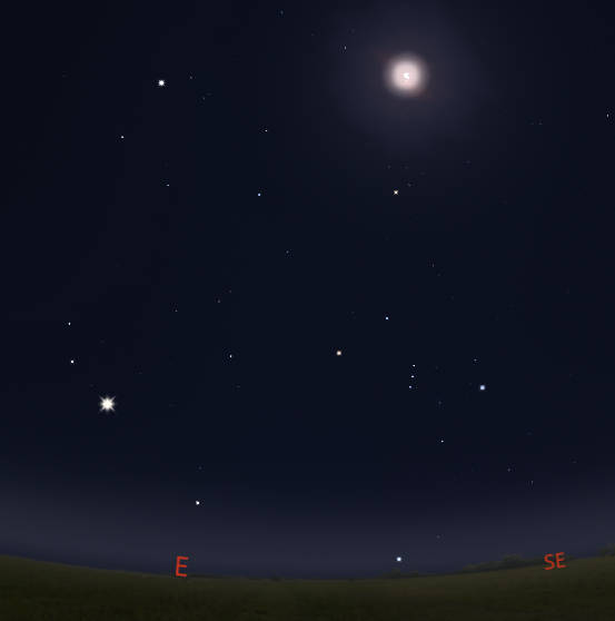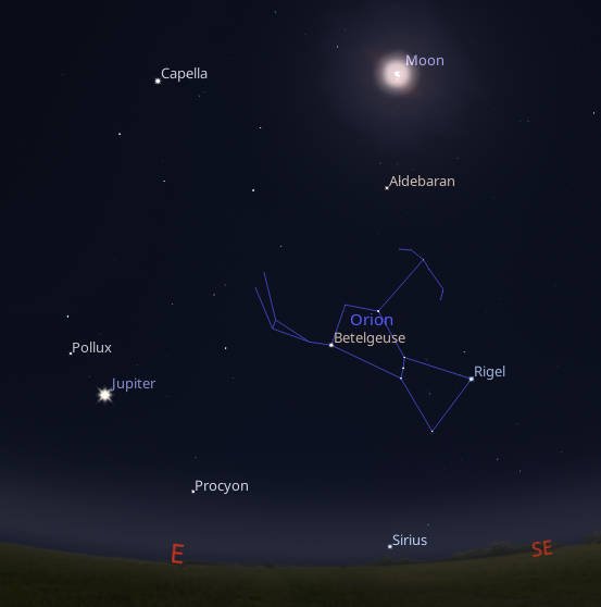 While the full moon overpowers most stars, the bright stars of winter persist. This is even true with tonight’s supermoon, a bit larger and brighter than average. Nowhere in the sky is there a concentration of bright stars as there is in the winter sky. I know it’s not winter yet, but if you stay up late enough, say 10 PM, all the winter stars will be in the sky. Last to rise is the brightest star of all, Sirius. And by 10 o’clock will be low in the southeast. Jupiter has joined the winter stars this year, outshining them all. As a constellation the mighty hunter Orion is easiest to spot on a full moon night, containing seven very bright stars, with three bright stars in a straight line as his belt, which most folks find as his most distinctive feature.
