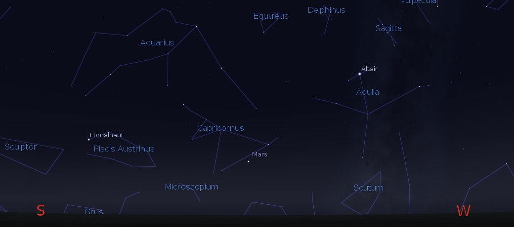 The southernmost star in the Summer Triangle of three bright stars is Altair, high in the south-southeast in the evening. It’s in the head of the constellation Aquila the Eagle. Altair is flanked by two stars, the eagle’s shoulders, and farther out are the wing tips. Other stars to the lower right are in its body and a last three in its tail. Near the tail binoculars will show a fuzzy spot that telescopes show as a compact star cluster, sometimes called the Wild Duck Cluster for its nearly triangular shape. Aquila is flying northeastward through the Milky Way, where it is split in two by a cloud of gas and dust. According to mythology the Trojan boy Ganymede was taken to heaven at the behest of the god Zeus by this eagle.