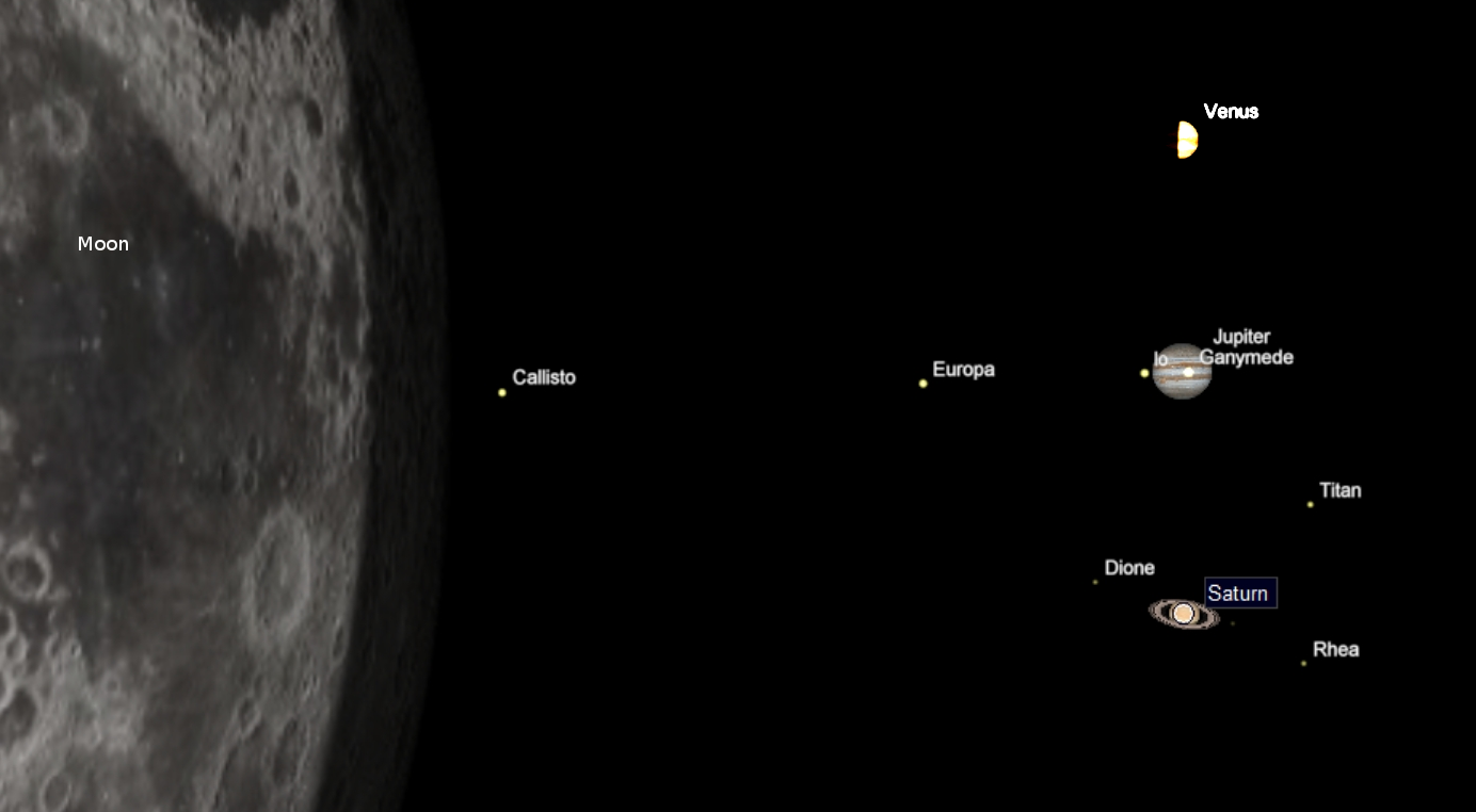 Jupiter and its moons as simulated by Cartes du Ciel for tonight, 10 p.m. April 12, 2016. The bodies, from let to right are Ganymede, Callisto. a background star, Jupiter, Io, and Europa.