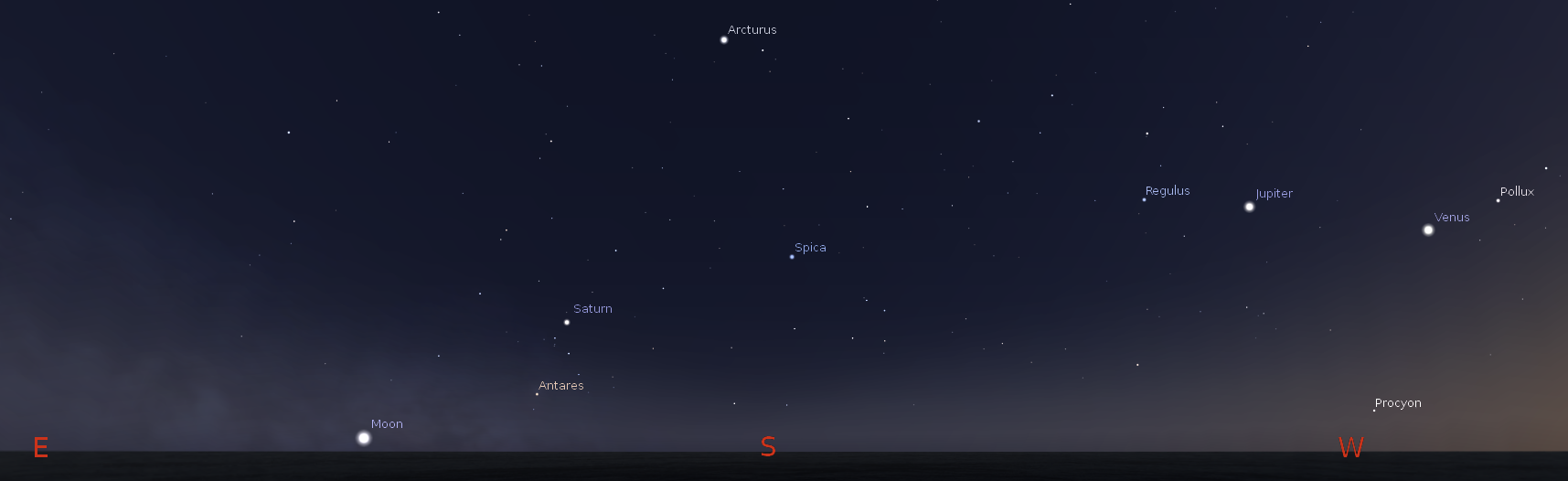 The evening planets and bright stars, including the Moon, at 10:30 p.m. June 3, 2015. Created using Stellarium. Click on Image to enlarge.