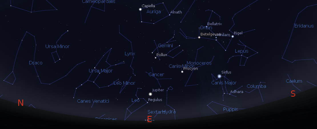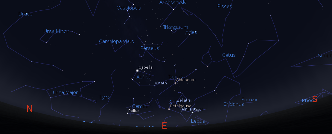 The Eastern sky got the Geminid meteor shower at midnight December 14, 2014. Created using Stellarium.