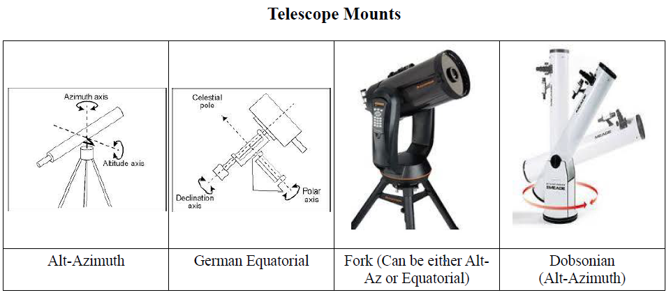 There are four basic mounts. Equatorial mounts have to be aligned to the earth’s axis in order to work properly to follow objects in the sky. Alt-Azimuth mounts are the simplest and easiest to set up, but all but the most sophisticated cannot be made to track objects in the sky as the Earth rotates. A relatively new addition to mounts is the computerized “Go To” feature allows the telescope to find objects itself when the mount is properly aligned to the sky. Telescopes with Dobsonian mounts have the largest aperture for the buck. Cheap telescopes tend to have cheap mounts that are hard to use and wobbly, especially the ones with German equatorial mounts. An alt-azimuth mount would be steadier in this case.