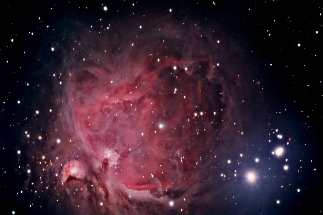 This short exposure by Scott Anttila shows the Trapezium. It’s a bit rotated and enlarged compared to the photograph above, but the red bars and the Trapezium match up.