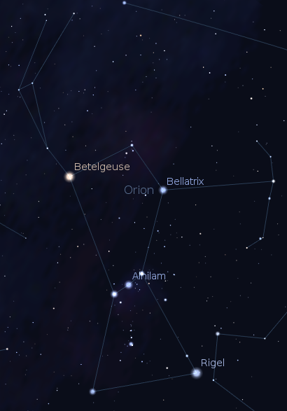 A couple of nebulae are seen here that are not in the text above. M78 is a small nebula north of the belt star Alnitak. It is visible in a telescope. The Witch Head Nebula, another large nebula, shining by the reflected light of Rigel. It’s officially in the neighboring constellation of Eridanus, and I believe strictly a photographic nebula. The witch head is best seen if the image is turned upside down.
