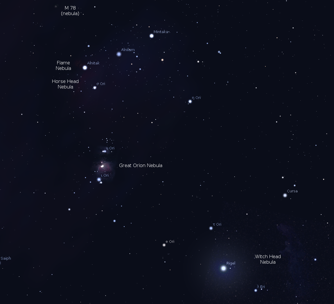 With the moon out of the sky, it’s a good time to get those binoculars or small telescope out to view at least one nebula in the constellation Orion the hunter and maybe even more. Orion is in the south with those belt stars lie in a straight line. Below the belt are three fainter stars, vertically arranged: Orion’s sword. In binoculars each of those stars are multiples. Around what looks like a center star there is a haze, which is the Great Orion Nebula, the nearest star forming region to us at around 1,400 light years away. Some of its gasses envelop the stars that make up the top star of the sword. Orion hosts the famous Horse head Nebula, which unfortunately can only be seen in photographs, It is right below the left star of the belt.