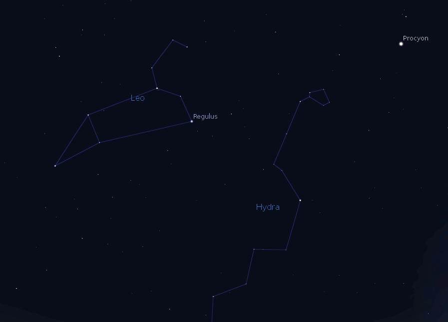 Today I will take a fresh, for me at least look at the constellation of Hydra the water snake of Greek origin and the Great Underwater Panther of our local Anishinabek people. Between the bright star Regulus in Leo the lion and Procyon in Canis Minor, Orion’s small hunting dog is a drooping group of 6 stars that makes up the head of Hydra. The rest of his stars trail snakily to the southeastern horizon at 10 p.m. He won’t be fully risen until 1 a.m. In the mythology of the Anishinabek people The head of Hydra is the head of the Great Underwater Panther, his back and tail run to Regulus and the front of Leo. In the spring of thinning ice when someone broke through it was credited to this panther, who pulled the person underwater.