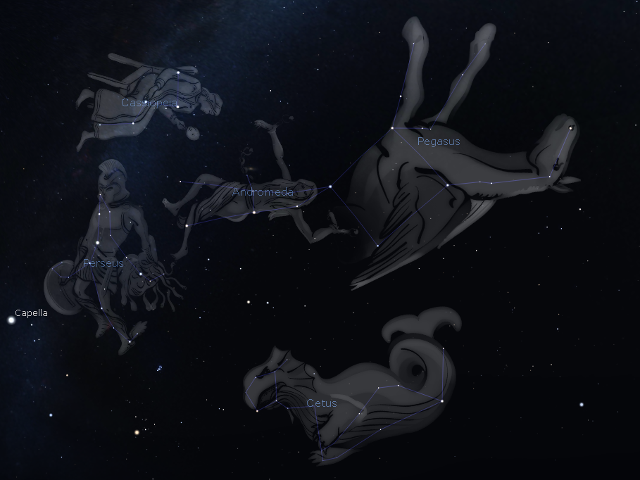I will be giving a presentation Autumn Stars, Galaxies Myths, and Stories tonight at this evening’s meeting of the Grand Traverse Astronomical Society at 8 p.m. at Northwestern Michigan College’s Rogers Observatory. In the autumn season we lose the southern part of the Milky Way in the southwest, but there are number of of constellations that tell a famous story, that’s even made it to the cinema twice in recent years. There’s a star that evilly winks at us, and a huge galaxy the is visible to the naked eye that will crash into our Milky Way galaxy in the far future. After the meeting there will be a star party starting at 9 p.m. featuring, if it’s clear the Moon, Jupiter, Saturn and that nearby galaxy.
