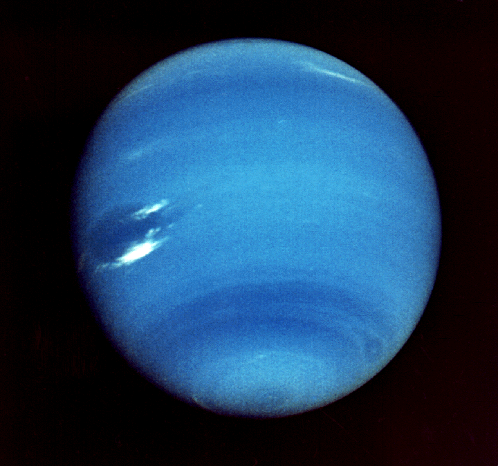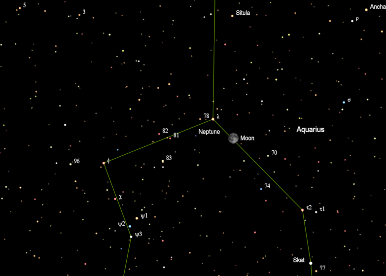 The sea green eighth planet from the Sun is named for the Roman god of the sea, Neptune. Today it is at opposition from the Sun, meaning it is opposite the Sun in the sky, rising at sunset. It resides at 30 times the Earth’s distance from the Sun. It is seen now against the stars of the constellation of Aquarius. While it is barely visible in binoculars the bright Moon will serve as a pointer to it tonight, but also make it hard to find. It will be three and a half moon widths left of the Moon* at 10 p.m. In telescopes it shows a tiny disk, so it’s not quite star-like. The large dark spot seen on Neptune in 1989 by Voyager 2 soon disappeared, however two years ago Neptune began to show activity again as seen from Earth and by the Hubble Space Telescope.