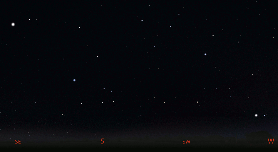 Stretching from midway up the sky in the south-southwest to low in the southeast at 10 p.m. can be found the constellation of Hydra the water snake, the longest constellation of all. Unlike the monster of the same name that Hercules slew, this Hydra has but one head, which is its most distinctive part. The head of Hydra is located between the bright stars Procyon in the southwest, which is above the brighter star Sirius low in the sky, and Regulus in Leo the lion, higher in the south. Hydra’s head is a small but distinctive group of 6 stars that make a drooping loop to the right. The rest of Hydra wends its way in a crooked line from star to star, but within a reasonably straight path down to the southeastern horizon.