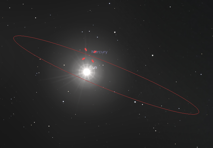 Mercury about 7 hours before inferior conjunction February 25, 2020 near local solar noon. The last inferior conjunction of Mercury on November 11, 2019 Mercury passed across the Sun’s disk in a transit. The red ellipse is Mercury’s orbit as seen From the Earth. It’s orbit is tilted about 7 degrees from the Earth’s orbit, so transits are fairly rare events. Created using Stellarium.