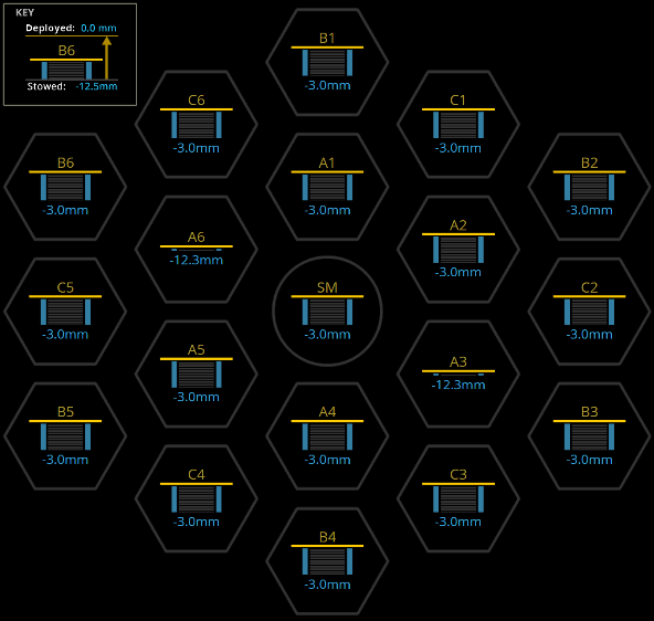 Mirror Alignment Tracker for January 17, 2022. It looks like most mirrors are about 3 millimeters from their final position. Shown are 19 mirrors, the center on, labeled SM is the secondary mirror, out in front of the primary mirror segments. Mirrors A3 and A6 have not moved forward very much. From their position, I assume that’s intentional. Credit: NASA.