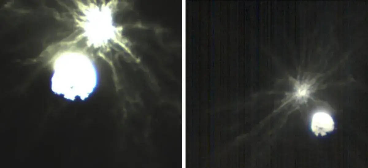 Two images from the LiciaCube satellite launched from the DART spacecraft 15 days before the impact, and trailing it to record the collision with its wide and narrow angle imagers. Dimorphos does appear to be a rubble pile asteroid from its appearance and the amount of ejecta caused by the impact. The ejecta adds to the effect of the spacecraft’s kinetic energy by pushing away from the asteroid by Newton’s third law of motion.