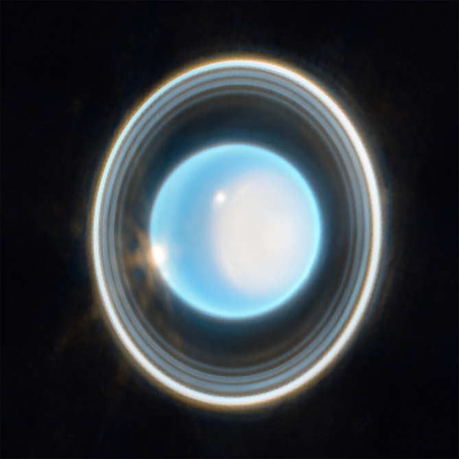 Today, the planet Uranus is in conjunction with the Sun. I don’t talk about Uranus that much, because it can’t be spotted in the sky with the naked eye. However, the James Webb Space Telescope observed it, and gave our clearest view of the planet since Voyager 2 flew past it in January 1986. Uranus has a system of rings, which were discovered in March 1977. Though not visible, they blocked the light of a star. Astronomers at the time were trying to get a more accurate diameter of the planet by timing the disappearance of a star behind the planet. Extra short dips in brightness before and after the main occultation revealed the existence of the rings. Uranus also has an extreme axial tilt of 98 degrees.