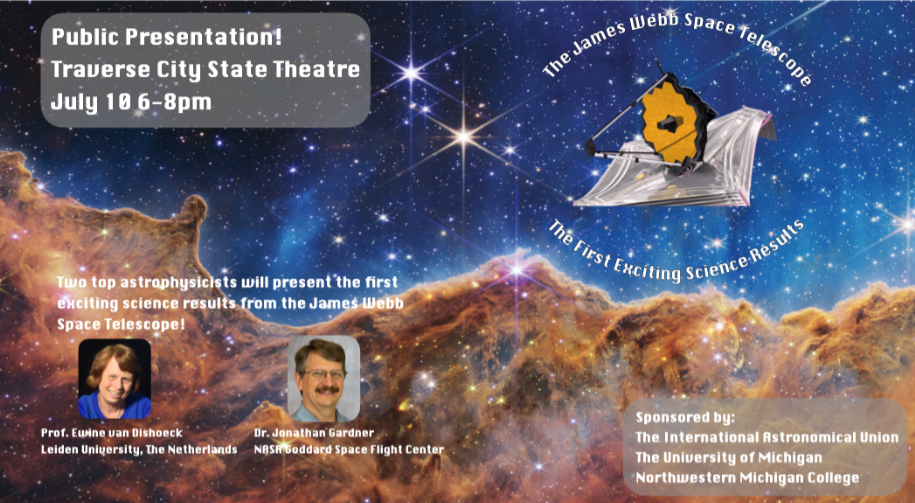 The International Astronomical Union, or IAU, is holding a symposium in Traverse City this week, a meeting of some of the world’s astronomers on the general topic of astrochemistry: From the First Galaxies to the Formation of Habitable Worlds, at the Park Place Hotel & Conference Center. As part of the meeting, there will be a presentation at the State Theater on East Front Street at 6 pm Monday, July 10, 2023 by Professor Ewine van Dishoeck and Dr. Jonathan Gardner on The James Webb Space Telescope – The First Exciting Results. There may still be some free tickets that can be obtained from the State Theater website: https://stateandbijou.org. The program is sponsored by the IAU, University of Michigan, Northwestern Michigan College and the Grand Traverse Astronomical Society.