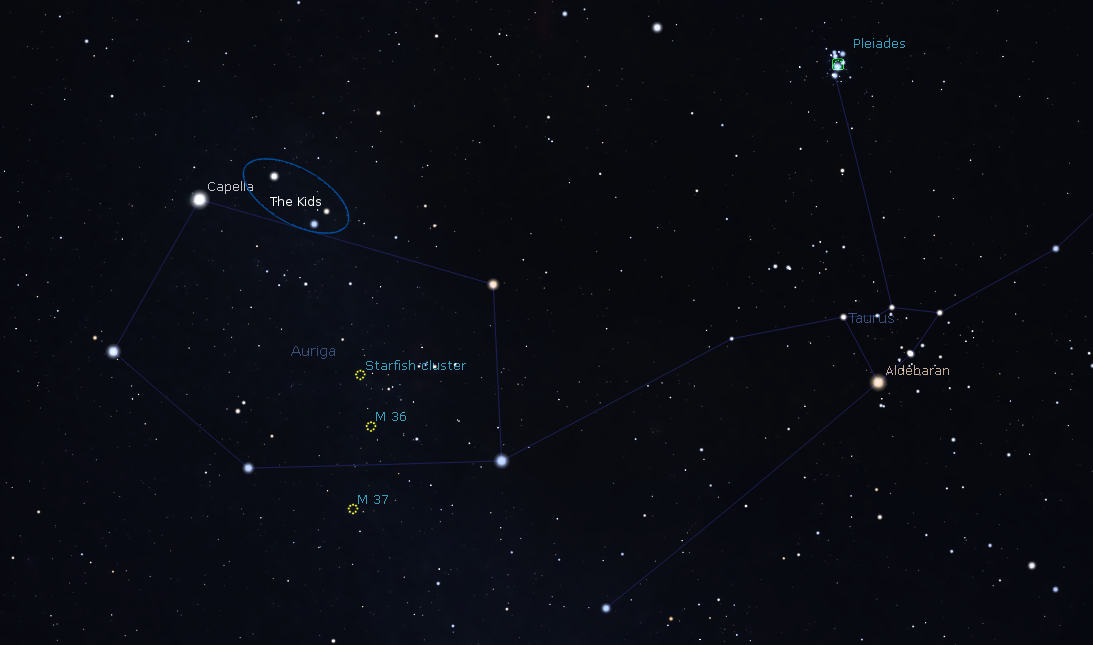 The first constellation of winter is in the northeastern sky, called Auriga the charioteer. It’s to the upper left of Orion and directly left of Taurus. Auriga actually never really quite leaves us, because its brightest star, Capella is the star that never leaves us even in the heat of summer, Though for most of us it’s in the trees in the north. Auriga is a pentagon of stars with the Capella on top. Just right of Capella is a thin triangle of three faint stars, an asterism or informal constellation called the Kids, baby goats. Capella is their mother. For some reason they are all held by a charioteer, who is without his chariot. And from all the Hollywood Biblical epic movies I’ve seen, it takes two hands to drive a chariot, and it doesn’t have a rumble seat.