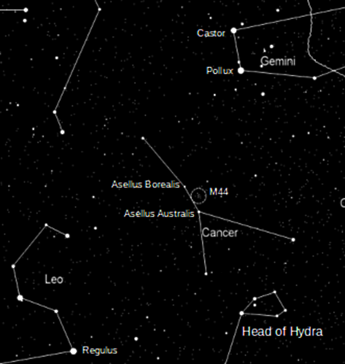 The constellation of Cancer the crab is made of dim stars, which are generally connected, in constellation charts, with lines that make either the letter K or an upside down Y, which lie directly between the star pair Castor and Pollux in Gemini and Regulus in Leo. In the center of the constellation is, what to the naked-eye is a fuzzy spot called Praesepe, or the manger. The two nearby stars, one to the northeast, and one to the southeast are Asellus Borealis, and Asellus Australis, the northern and southern donkey colts feeding out of the manger. Viewing that fuzzy spot with a pair of binoculars will reveal that it’s not fuzzy at all. It resolves into a cluster of stars, which astronomers, over the years, have called the Beehive cluster. Back in the first and second century CE, the Sun entered Cancer to begin the season of summer. It’s now just a transitional constellation between the winter and spring evening skies.