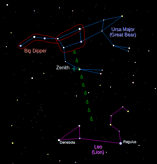 Using the Big Dipper to find Leo. The orientation is for 10 pm on May 8th. For any other time, the orientation would be different, as would the position of the zenith (overhead point). Created using my LookingUp app.