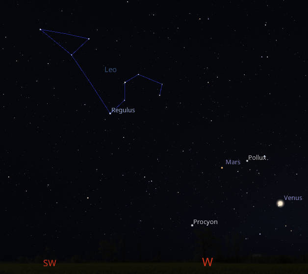 At 10 p.m. the spring constellation of Leo the lion will be high in the south. It can be found by locating the Big Dipper high overhead and imagining that a hole were drilled in the bottom of the bowl to let the water leak out. It would drip on the back of this giant cat. The Lion is standing or lying facing westward. His head and mane are seen in the stars as a backwards question mark. This group of stars is also called the sickle. The bright star Regulus is at the bottom, the dot at the bottom of the question mark. A triangle of stars, to the left of Regulus, is the lion’s haunches. Leo contains some nice galaxies visible in moderate sized telescopes. The stars in Leo’s part of the sky are fewer than those in the winter sky.