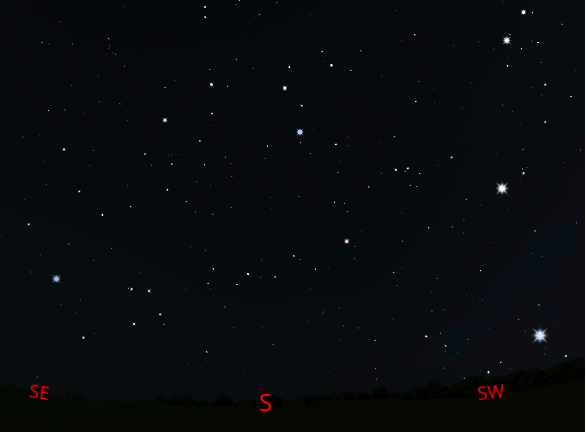 Looking to the east-southeast at 8 pm we look at three star groups or constellations. From left to right we have the Big Dipper and the Fisher Star in the northeast. Centered in the east we have Leo the lion. And on the right, just west of south, we have Orion the central winter constellation. Click or tap on the image to enlarge it. Credit: Stellarium, and using LibreOffice Draw, and GIMP.