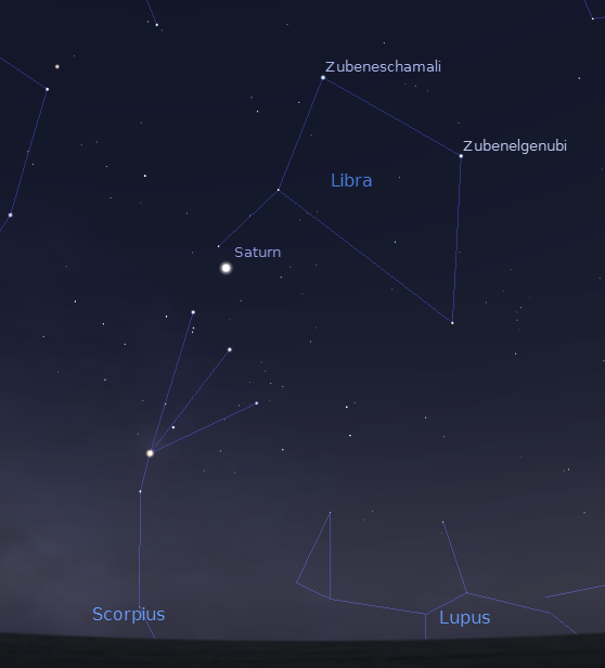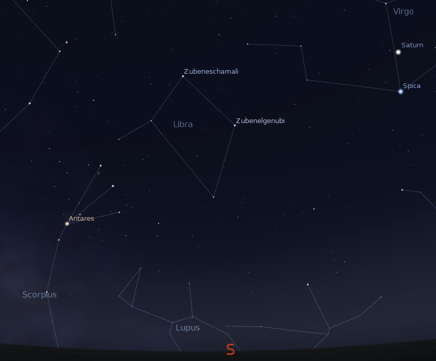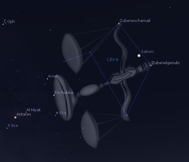 One of the constellations of the Zodiac or circle of animals isn’t either animal or human. It is Libra the Scales or balance. It lies low in the southern sky at 11 p.m., just to the right of the rising Scorpius the scorpion. Libra, it seems, is an afterthought, a simple diamond shape of four stars. This year with Saturn inside. Its two brightest stars Zubeneschamali and Zubenelgenubi translate to the north and south claw respectively, of Scorpius to the left of it. The Arabs, at least, seemed to view this as part of Scorpius. The balance was perhaps to signify the equality of day and night, at the time the sun was in this part of the sky at the start of autumn, over 2000 years ago. Nowadays the sun is one constellation west, in Virgo at the start of autumn.