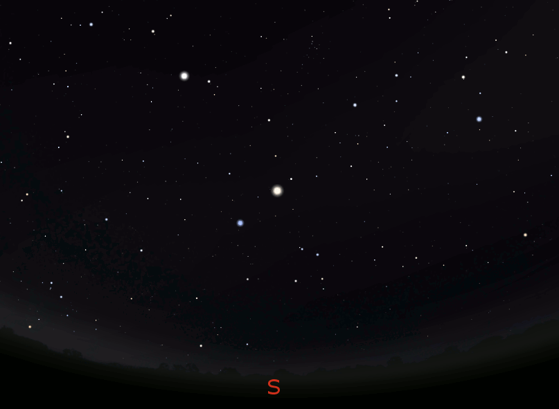 Libra the scales or balance is a dim constellation which is seen low in the southeast in the evening now. It is one of the constellations of the Zodiac. The term Zodiac means circle of animals, so Libra doesn’t exactly fit. The ancient Babylonians recognized it. Back then it may have represented the equality of day and night because the Sun would have been at the autumnal equinox in Libra at that time. The early Greeks, and possibly the Arabs, did not see Libra as being separate from the constellation of Scorpius the scorpion, which is rising to its lower left. Its two brightest stars have Arabic names meaning north claw and south claw. Scorpions have claws, and last I’ve checked, balances do not.