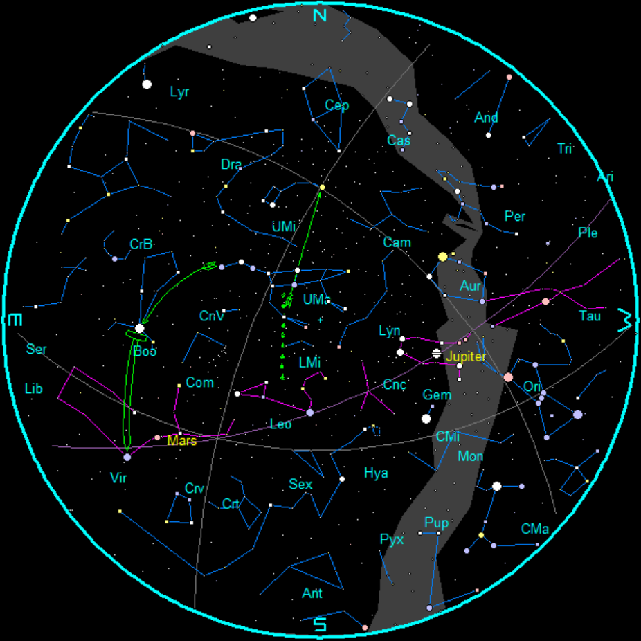 The 4th month of the year begins tomorrow. Daylight hours in the Interlochen/Traverse City area and will increase from 12 hours and 46 minutes tomorrow to 14 hours 11 minutes on April 30th. The altitude, or angle, of the sun above the southern horizon at local noon will be 50 degrees tomorrow and will ascend to 60 degrees on April 30th. The altitude of the sun in the Straits area will be a degree lower. The actual time of local apparent noon this month for the Interlochen/Traverse City area, when the sun passes due south, will be about 1:43 p.m. The big event for this month will be a total lunar eclipse visible from our area in the wee hours of the morning on April 15th. It’s the first or two lunar eclipses visible from here this year. The other is in October.