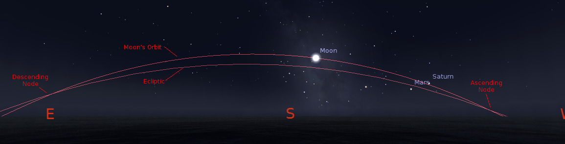 In the image above the Moon’s orbit is compared to the ecliptic, the plane of the Earth’s orbit to which it’s inclined by about 5º. Note the two points where these lines cross. The point where the Moon’s orbit crosses the ecliptic heading northward is called the ascending node. The crossing point heading southward is the descending node. The important thing about that is the when the moon passes a node while at new or full, an eclipse will occur, which they will do in October. There will be a total lunar eclipse on the morning of October 8th, then a partial solar eclipse on October 23rd as the sun is setting here in northern Michigan. I’ll have more information as the events gets closer.
