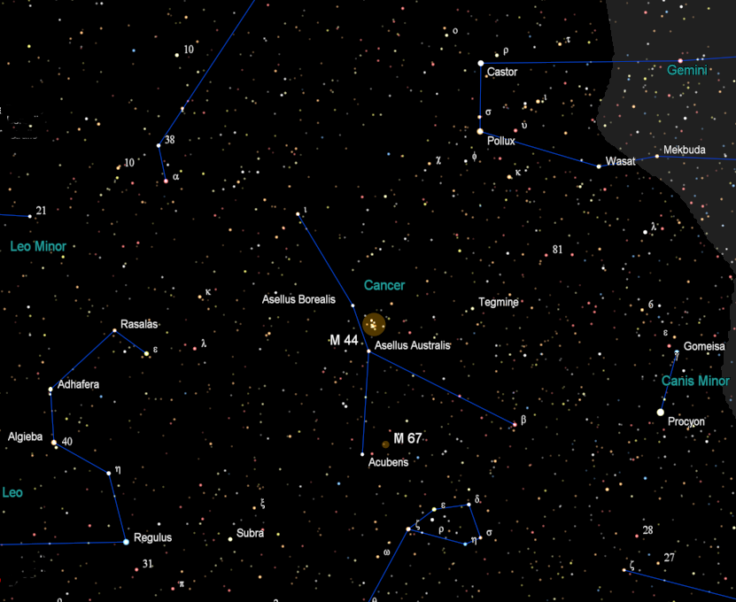At 10 PM, between the stars Castor and Pollux in Gemini high in the southwest and the star Regulus in Leo the Lion in the southeast lies the dimmest constellation of the zodiac, Cancer the crab. To me its 5 brightest stars make an upside down Y. There are the stars in the center of the constellation Asellus Borealis and Asellus Australis, the north and south donkeys. There’s a fuzzy spot between and just west of them called Praesepe, the manger, from which they are eating hay. In binoculars, it resolves into a cluster of stars called the Beehive cluster. We amateur astronomers also know it as M44, the 44th object on 18th century comet hunter Charles Messier’s list of fuzzy objects that might be mistaken for comets.