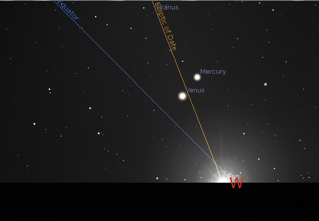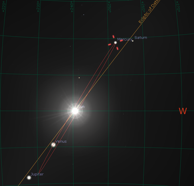 Note in the charts above and below the line passing through the Sun, and the one the planets hang around is the ecliptic, the projection of the Earth’s orbit on the celestial sphere. The grid line running through the west compass point at the horizon is the celestial equator. I’m allowing us to see below the horizon. As planets rise, move across the sky and set they will appear to move parallel to the celestial equator.