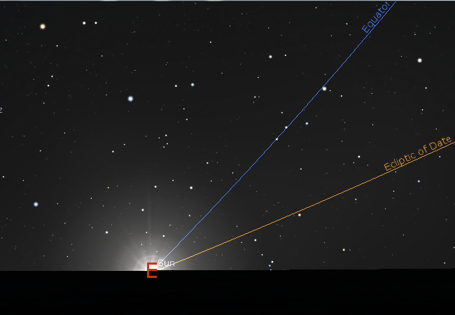 Celestial equator and ecliptic at the September equinox showing how low it appears. Created using Stellarium.