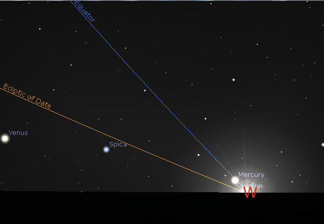 On the September equinox the ecliptic, near where the planets hang out, reaches its most horizontal at near 22°. This makes planets, including Mercury appear lower in the sky near sunset, and as they set, moving parallel to the equator, will set shortly after the Sun. This September Venus happens to be approaching its inferior conjunction and is very close to the Earth. This exaggerates its orbital inclination. in this case shows the planet a good deal south of the ecliptic.