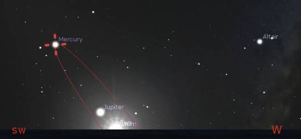 Mercury last August 16 at greatest eastern elongation. Note how low Mercury is to the horizon at sunset. Created using Cartes du Ciel (Sky Charts).