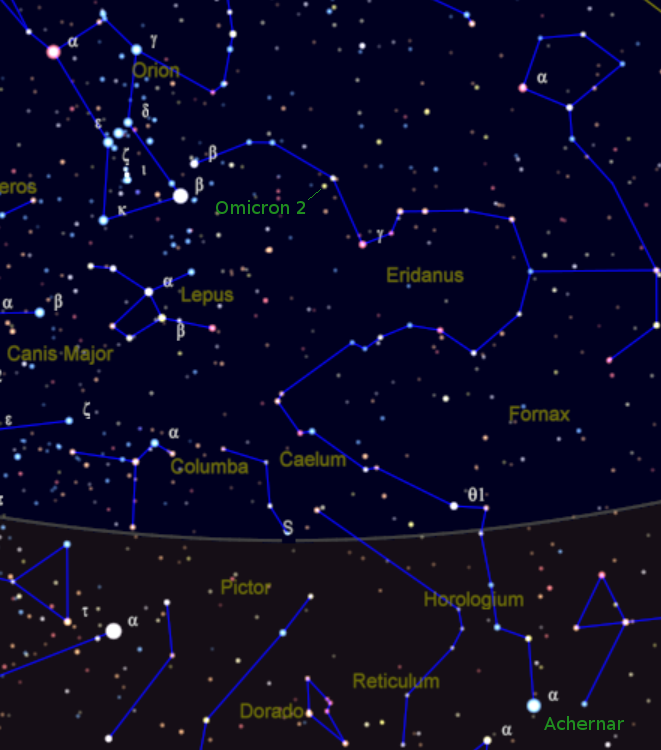There is a long and sinuous constellation that’s part of the winter sky. It is Eridanus, which depicts a river. The river starts near the lower right corner of Orion, near the bright star Rigel and flows to the right then down near the southern horizon, then it meanders below the horizon. One has to travel to the far southern United States or even farther south to see the southern terminus of the river, the bright star Achernar. Writers over the ages have seen here the Nile and the earth circling river Ocean of the flat earth days. One of its stars is close to us and famous. It’s Omicron 2 Eridani a triple star system and the fictional home to Mr. Spock and other Vulcans of the Star Trek franchise. No real planet has been found there. Yet.