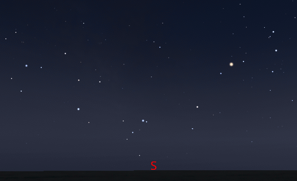 Scorpius the scorpion is now seen low in the southern sky in the evening. To me, the stars here make a very good scorpion. Scorpius was invented by the people of the Middle East, where scorpions are plentiful. The Anishinaabe native peoples of our area, however, saw one of their legendary hero figures, Nenabozho*. In the sky, the arc of three stars at the front of the scorpion and to the right of the bright star Antares is his bow. He is shooting an arrow toward the receding Great Panther or Curly Tail a constellation of spring whose curl of a tail is the head of the constellation Leo, now lost in the evening twilight in the west. Nenabozho was a hero in their creation stories, and a trickster who was sometimes seen as a rabbit.
