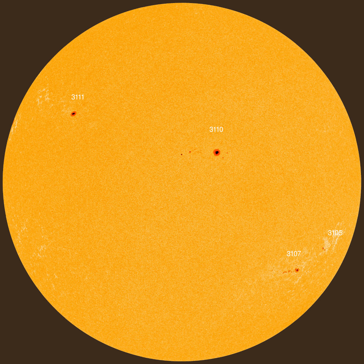 The Sun in white light, by the Solar Dynamics Observatory on September 30, 2022. What is seen is the photosphere, the visible “surface” of the Sun, where the energy transport from the interior changes from convection to radiation. The apparent roughness of the surface are the tops of the convection cells, called granules, which are usually about 600 miles wide that bubble up and recede. The numbers label active areas. The dark spots are sunspots, areas of intense magnetic activity. Brighter wispy or splotchy areas are faculae and are associated with sunspots or precursors of a new group forming. The rotation of the Sun will move the surface features from left to right in this image with north up. Telescopes may show the image upside down or mirror reversed. Click on the image to enlarge it. Credit NASA/SDO.