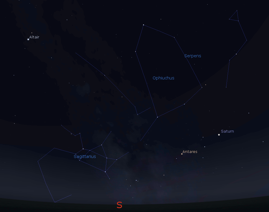 The planet Saturn and the red star Antares shine in the south-southwest at 10:30 p.m. In the and around constellation of Scorpius. In the area of sky above it lies a large constellation of faint stars called Ophiuchus, the serpent bearer. The constellation shape is like a large bell, which reminds me of the head, shoulders and arms of a fellow that’s holding the snake-like a weight lifter pulling up a heavy bar bell. The serpent he’s holding is Serpens, the only two part constellation in the heavens. The head rises to Ophiuchus’ right and the tail extends up to the left. In legend Ophiuchus was a great physician, educated by the god Apollo, and the centaur Chiron, also found in the stars as Sagittarius, below and left of him.