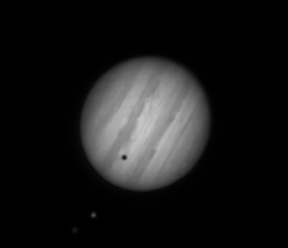 Rocking animation of the early stages of the shadow show on Jupiter. Callisto’s shadow already on the planet while Io’s shadow is just entering. Also Io’s transit is starting., following it’s shadow on the planet. Credit: Scott Anttila