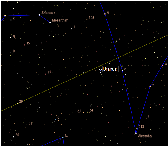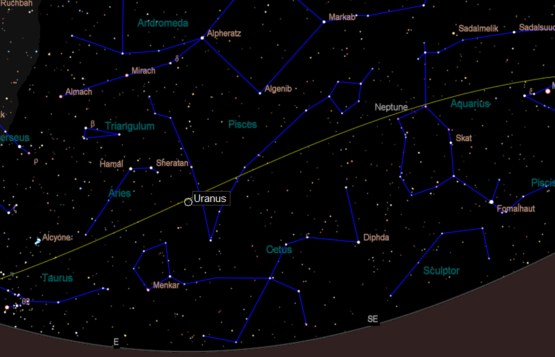 Later tonight the planet Uranus will reach opposition from the Sun. This is also about the time it is closest to the Earth at 18.9 Astronomical Units, or 18.9 times the Earth’s distance from the Sun, or 1.8 billion miles away. Uranus now is just barely visible to the naked eye by those with perfect vision at magnitude 5.7. It is fairly easy to spot in binoculars as a blue-green star. There are no blue-green stars. However it is in a rather star poor part of the sky. It is close to the bright Moon tonight, so I’d wait until Sunday night to try to spot it in dark skies. Then Uranus will be in the east at 9 p.m. below and right of the rightmost star of the three brightest stars of the constellation Aries. About half way from that star to the bottom leftmost star of Pisces. Uranus was the first new planet found since antiquity by William Herschel in 1781.