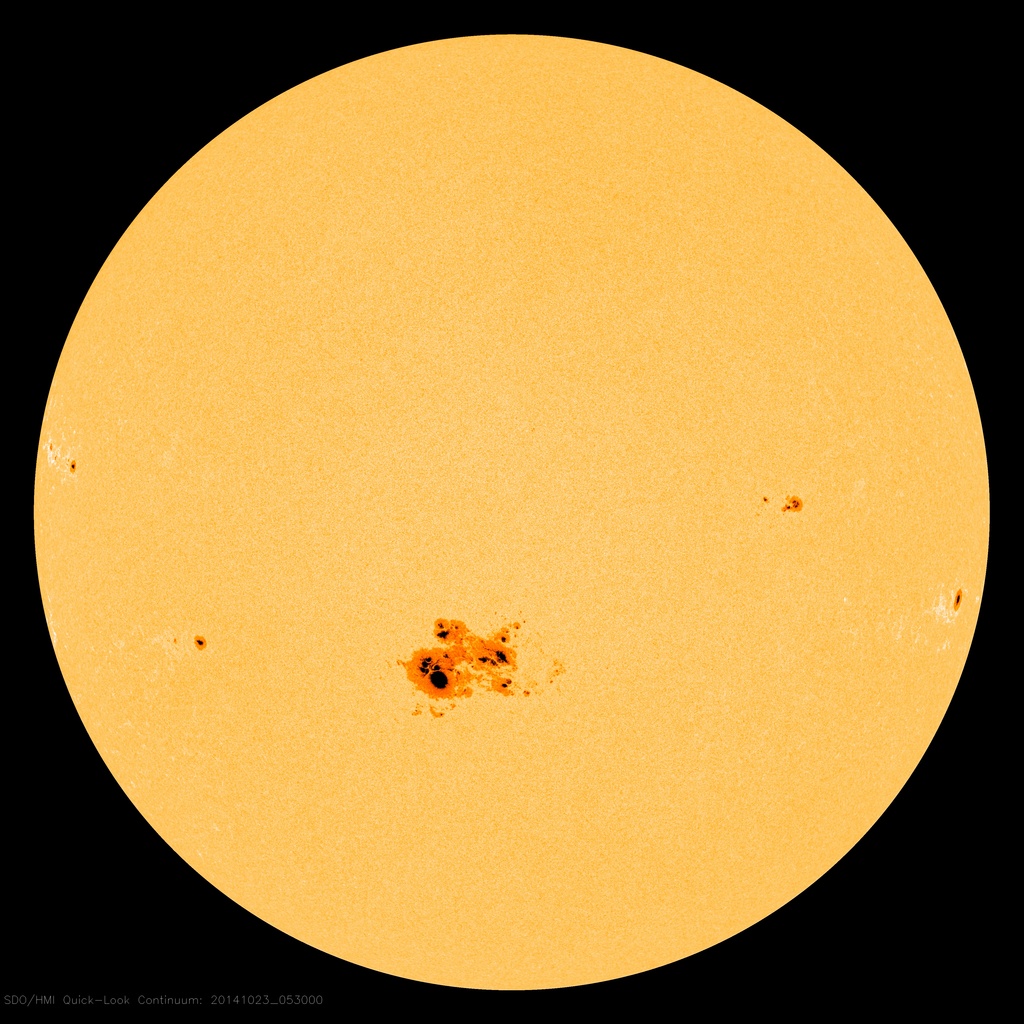 The Sun at 1:30 a.m. 10/23/2014 with large sunspot group AR 2192. Credit NASA – Solar Dynamics Observatory.