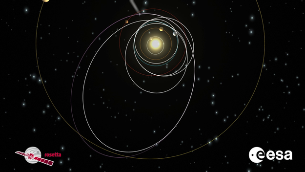 Rosetta is solar-powered with enormous solar panels, yet it could not maintain it normal operations load when farther than 4.5 Astronomical Units (AU) from the Sun so controllers put the spacecraft in hibernation in May of 2011 with instructions to wake up and phone home on January 20, 2014. The signal came about a half hour late, but Rosetta woke up after 31 months in hibernation.
