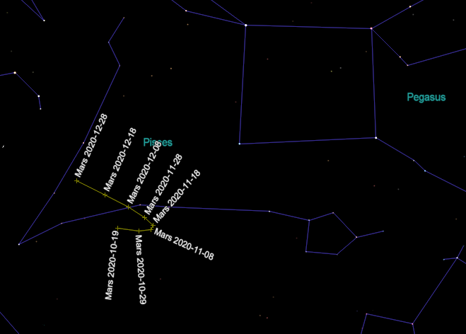 Mars’ apparent path for the rest of 2020 stays within Pisces. Mars doesn’t do a loop de loop as the ancients thought when they thought the Earth was motionless. It’s the effect of the Earth passing Mars in their orbits. Mars will stop its westward or retrograde motion around November 13th and resume its normal eastward motion. This view created using Cartes du Ciel (Sky Charts).