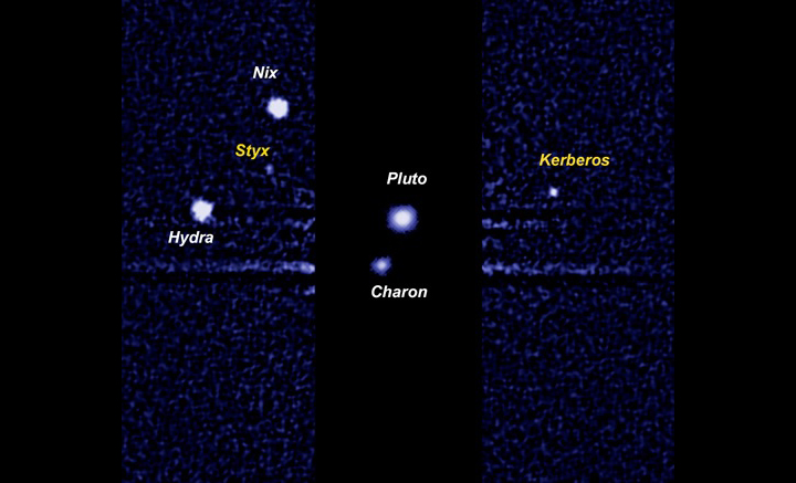Pluto and its moons as photographed by the Hubble Space Telescope. Pluto and Charon were filtered to reduce their brightness to bring out the other dim moons. Credit: NASA/Hubble.