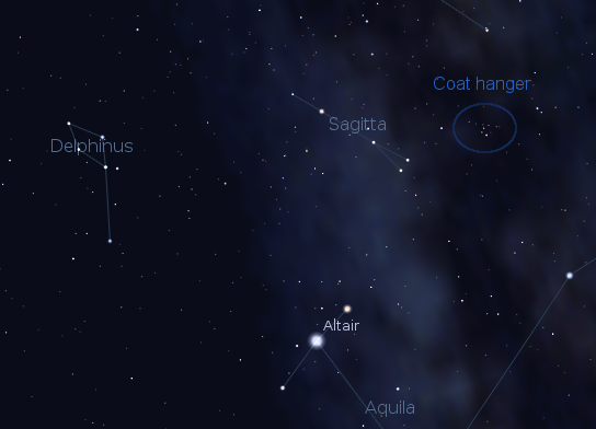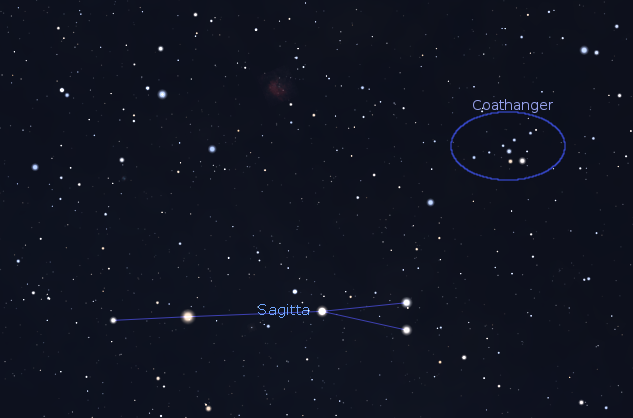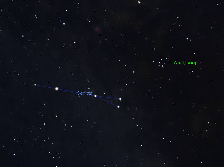 I’ve already talked about the three constellations whose bright stars mark the Summer Triangle: Vega in Lyra the harp, Deneb in Cygnus the swan, and Altair in Aquila the eagle. There are two small constellations near the south end of the triangle near Altair. These are Delphinus the dolphin and Sagitta the arrow. Delphinus is easily spotted, as it’s five or six stars appear as a tiny dolphin leaping out of the water. Sagitta appears as a very short arrow. An interesting sight can be spotted in binoculars near the tail end of Sagitta. It’s 7 stars in a nearly straight line, with a hook of four stars below the center of the line. It’s called The Coathanger. It’s even better if seen in a finder telescope, which inverts the image.