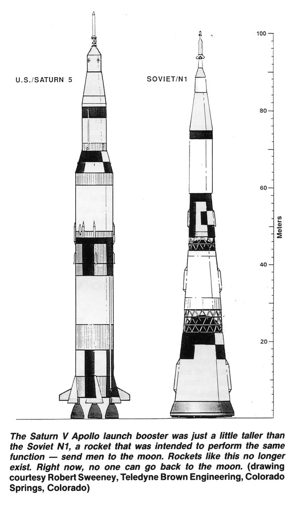 Comparison between The United States Saturn V and the Soviet N-1. Credit: Griffith Observer, the magazine of Griffith Observatory.